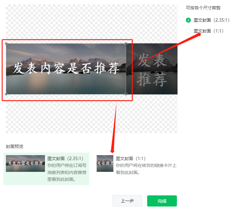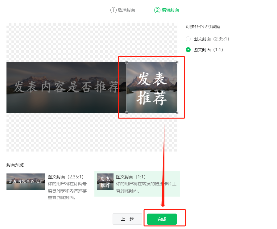 接下来选择箭头所指的右侧的图文封面(1:1)或下方的图文封面(1:1)均可,点击之后会看到上方的矩形框已经变为方形框,此时拖动方形框至最右侧,则1:1图文封面也设置完整。