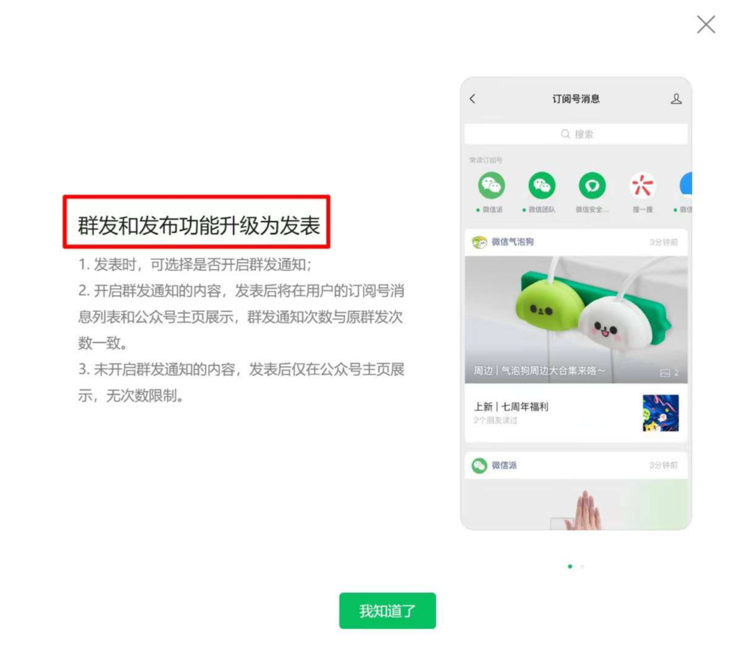 开启【群发通知】:发表的内容将推送给用户(关注公众号的读者),展示在【订阅号消息】列表、公众号会话和公众号主页等场景下。