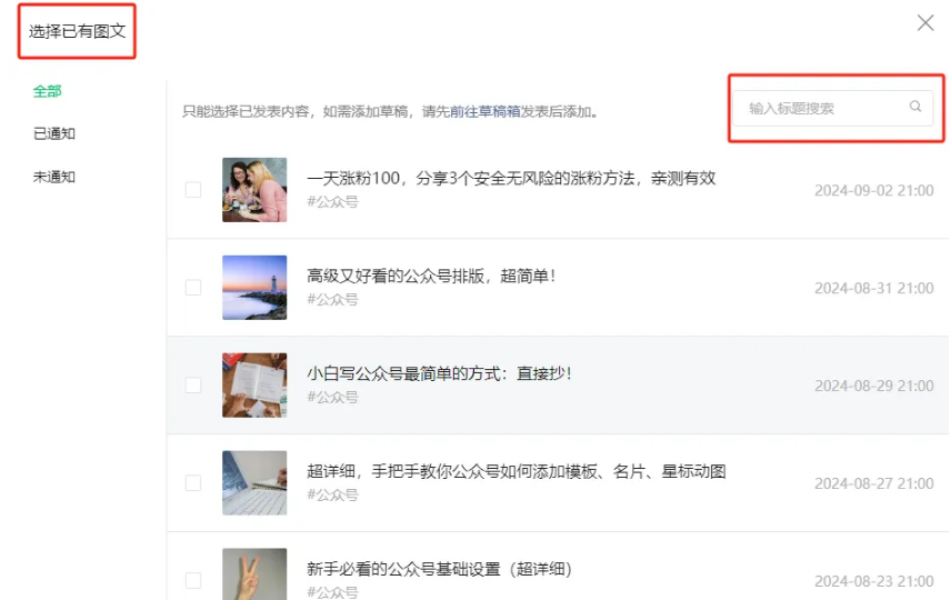 点击【添加已有内容】,选择之前自己发布的文章加入到此合集即可。