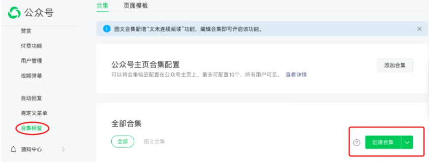 注意:在主页最多只能展示10个合集,只要进入到我们公众号主页的用户都可以看到这些合集。